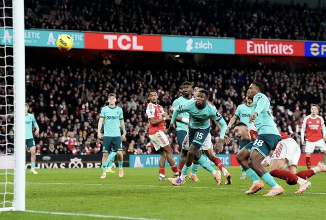 萨卡开出的角球击中远门柱后,不偏不倚地砸在毫无防备的约翰斯通的后脑勺上弹入空门,阿森纳就这么如释重负地领先了。